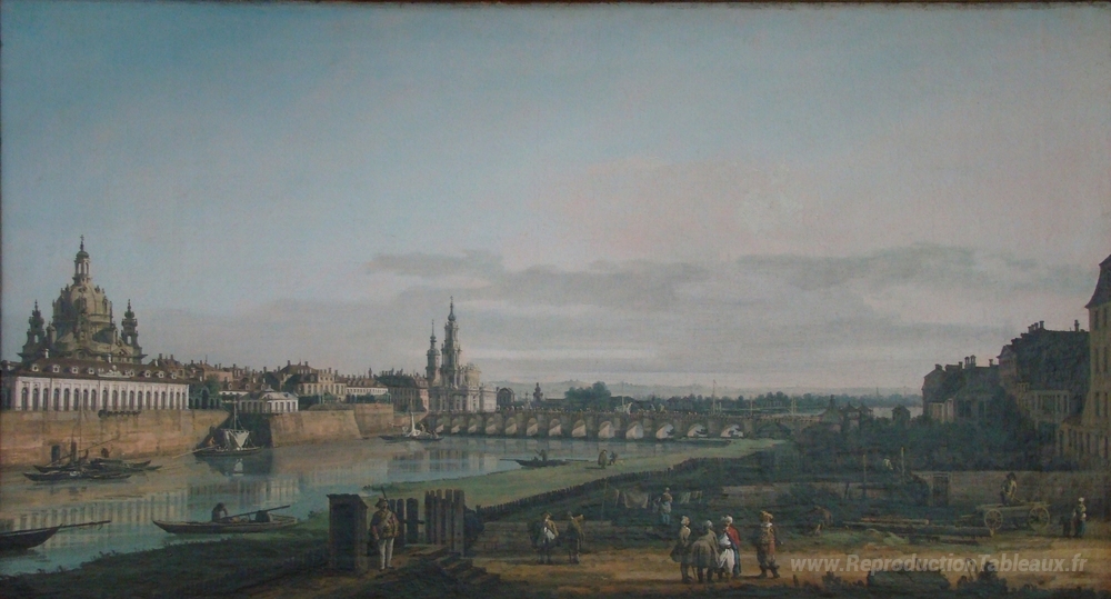 Nous vous proposons une reproduction artisanale sur toile du célèbre tableau 'Dresde vue de la rive droite de l'Elbe, en dessous du pont Augus' de Bernardo Bellotto, provenant du Musée de la Reproduction.