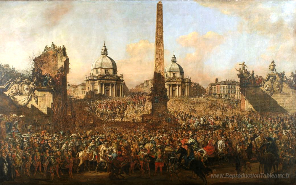 Nous vous proposons une reproduction artisanale sur toile du célèbre tableau 'Entrée à Rome d'Ossolinski Jerzy, émissaire de Wladyslaw IV de P' de Bernardo Bellotto, provenant du Musée de la Reproduction.