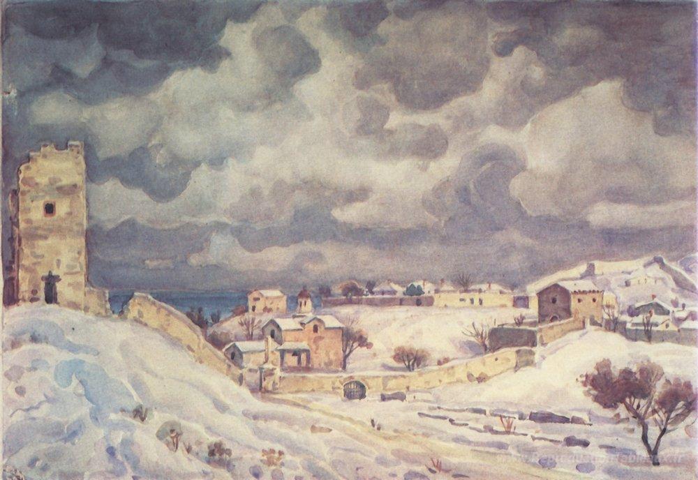 Nous vous proposons une reproduction artisanale sur toile du célèbre tableau 'Feodosie en hiver' de Konstantin Bogaevsky, provenant du Musée de la Reproduction.