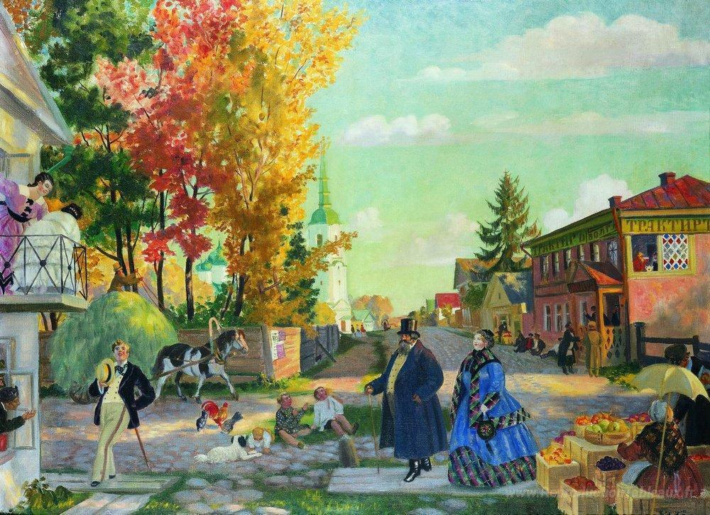 Nous vous proposons une reproduction artisanale sur toile du célèbre tableau 'Festivités d'automne' de Boris Kustodiev, provenant du Musée de la Reproduction.