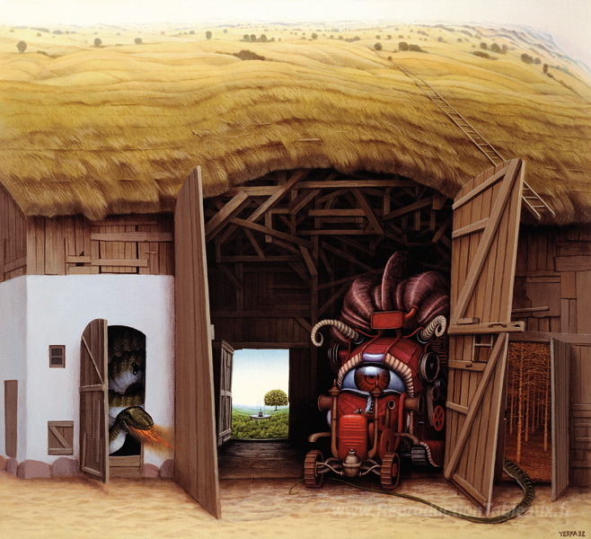 Nous vous proposons une reproduction artisanale sur toile du célèbre tableau 'Gagnant de l'URSUS' de Jacek Yerka, provenant du Musée de la Reproduction.