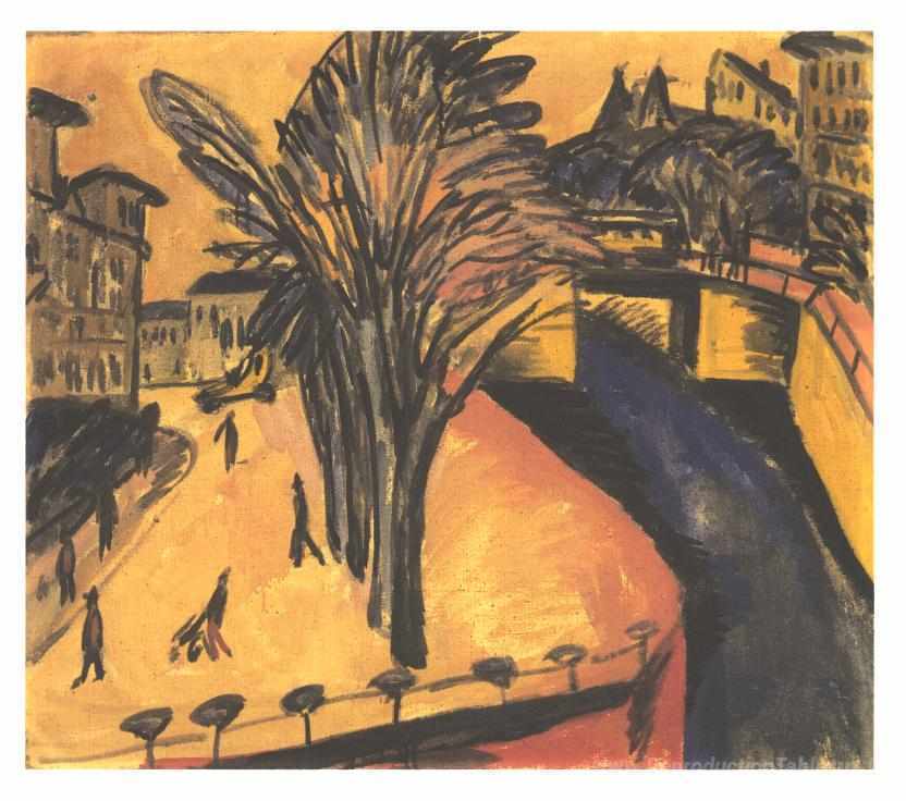 Nous vous proposons une reproduction artisanale sur toile du célèbre tableau 'Gelbes Engelufer à Berlin' de Ernst Ludwig Kirchner, provenant du Musée de la Reproduction.