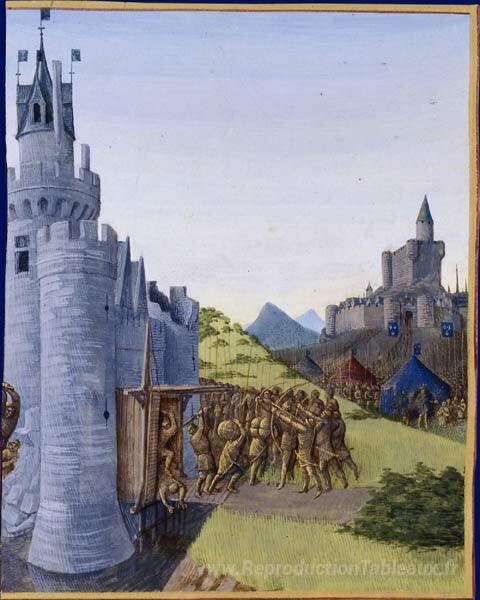 Nous vous proposons une reproduction artisanale sur toile du célèbre tableau 'Guerre entre Girard de Cazaubon et le conte di Foix. Reddition d' de Jean Fouquet, provenant du Musée de la Reproduction.