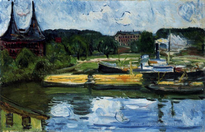 Nous vous proposons une reproduction artisanale sur toile du célèbre tableau 'Harbour de Lübeck avec le Holstentor' de Edvard Munch, provenant du Musée de la Reproduction.