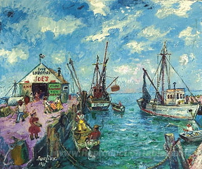 Nous vous proposons une reproduction artisanale sur toile du célèbre tableau 'Homards en direct chez Joe' de David Burliuk, provenant du Musée de la Reproduction.