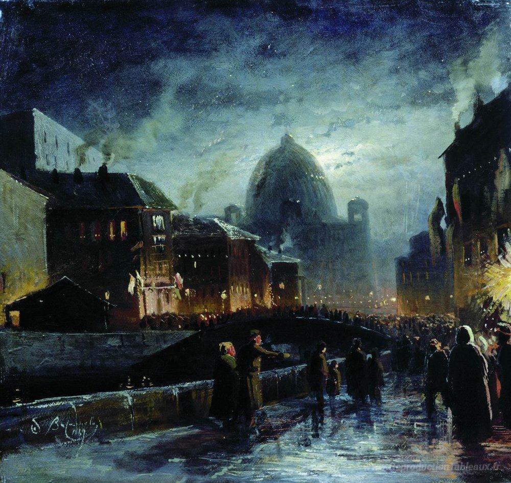 Nous vous proposons une reproduction artisanale sur toile du célèbre tableau 'Illumination à Saint-Pétersbourg' de Fyodor Vasilyev, provenant du Musée de la Reproduction.