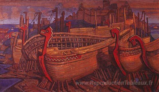 Nous vous proposons une reproduction artisanale sur toile du célèbre tableau 'Ils construisent les navires' de Nicholas Roerich, provenant du Musée de la Reproduction.