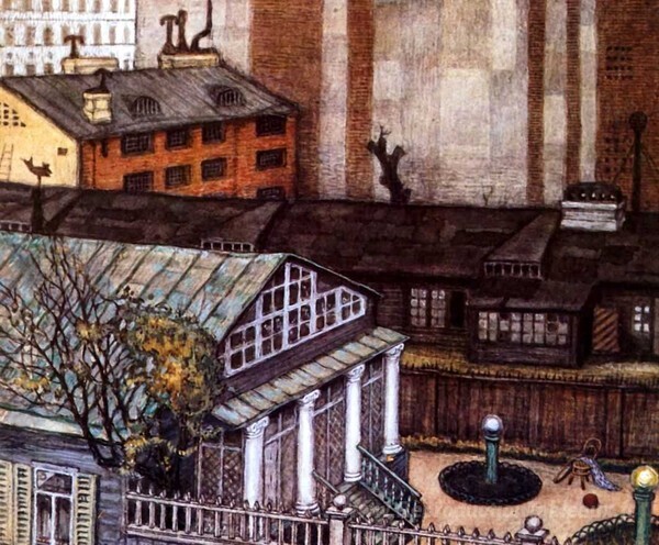 Nous vous proposons une reproduction artisanale sur toile du célèbre tableau 'Jardin dans la ville' de Mstislav Dobuzhinsky, provenant du Musée de la Reproduction.