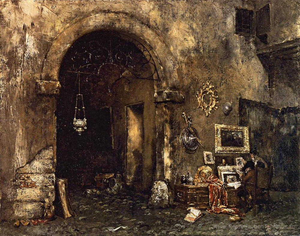 Nous vous proposons une reproduction artisanale sur toile du célèbre tableau 'La boutique antiquaire' de William Merritt Chase, provenant du Musée de la Reproduction.
