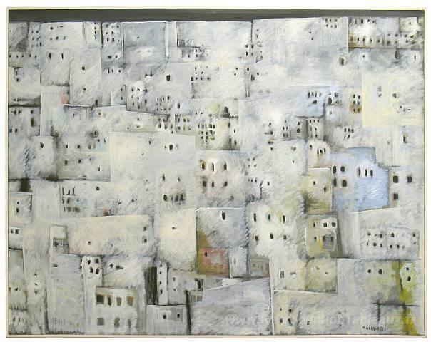 Nous vous proposons une reproduction artisanale sur toile du célèbre tableau 'La città' de Conrad Marca-Relli, provenant du Musée de la Reproduction.