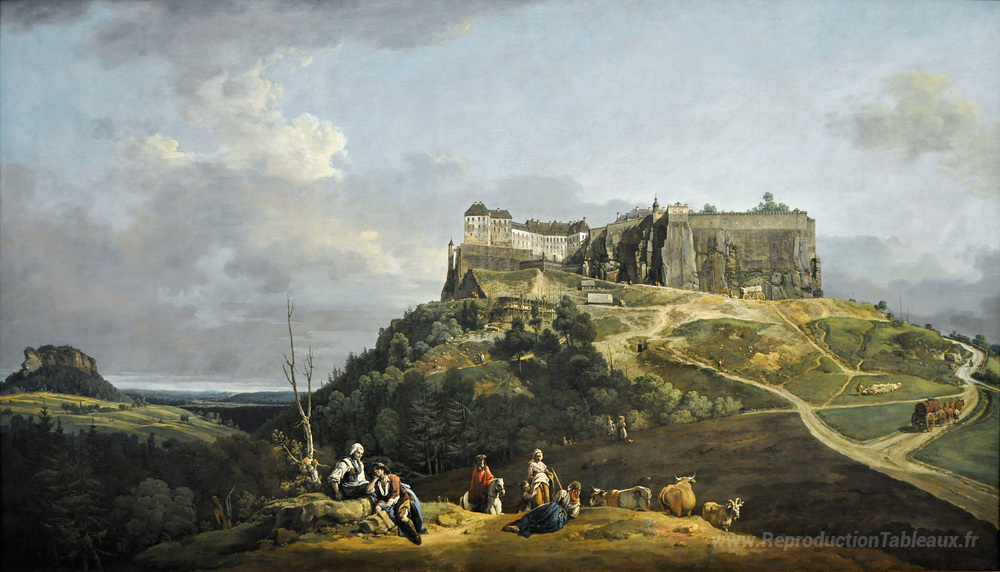 Nous vous proposons une reproduction artisanale sur toile du célèbre tableau 'La forteresse de Konigstein' de Bernardo Bellotto, provenant du Musée de la Reproduction.