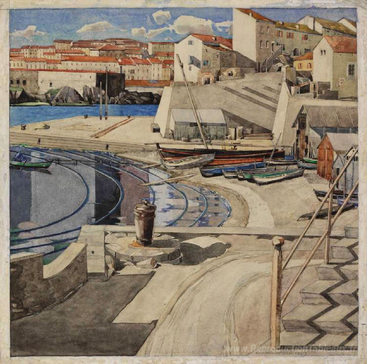 Nous vous proposons une reproduction artisanale sur toile du célèbre tableau 'La petite baie, ports de port' de Charles Rennie Mackintosh, provenant du Musée de la Reproduction.