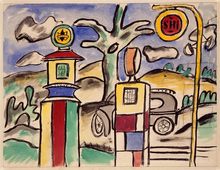 Nous vous proposons une reproduction artisanale sur toile du célèbre tableau 'La station-service (étude pour la ville)' de Fernand Leger, provenant du Musée de la Reproduction.