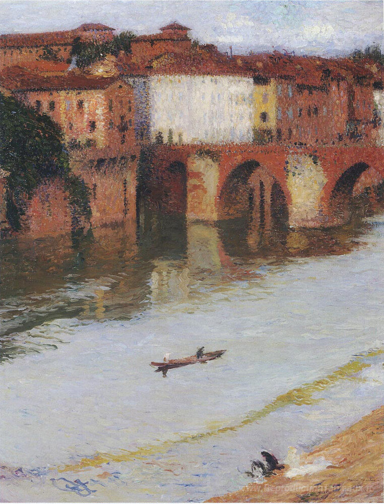 Nous vous proposons une reproduction artisanale sur toile du célèbre tableau 'L'ancien pont' de Henri Martin, provenant du Musée de la Reproduction.