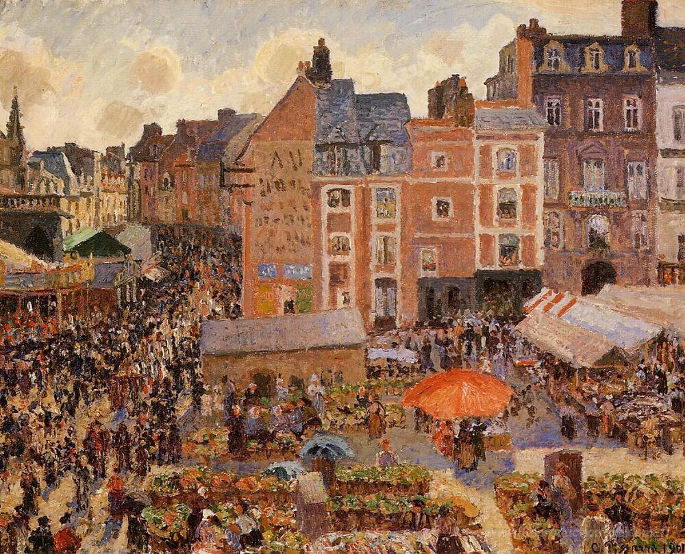 Nous vous proposons une reproduction artisanale sur toile du célèbre tableau 'L'après-midi ensoleillé de Fair, Dieppe' de Camille Pissarro, provenant du Musée de la Reproduction.