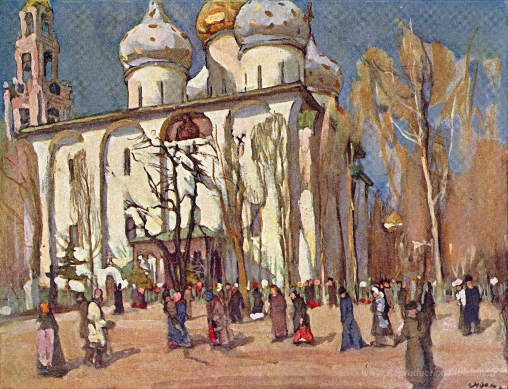 Nous vous proposons une reproduction artisanale sur toile du célèbre tableau 'Le jour de la célébration' de Konstantin Yuon, provenant du Musée de la Reproduction.