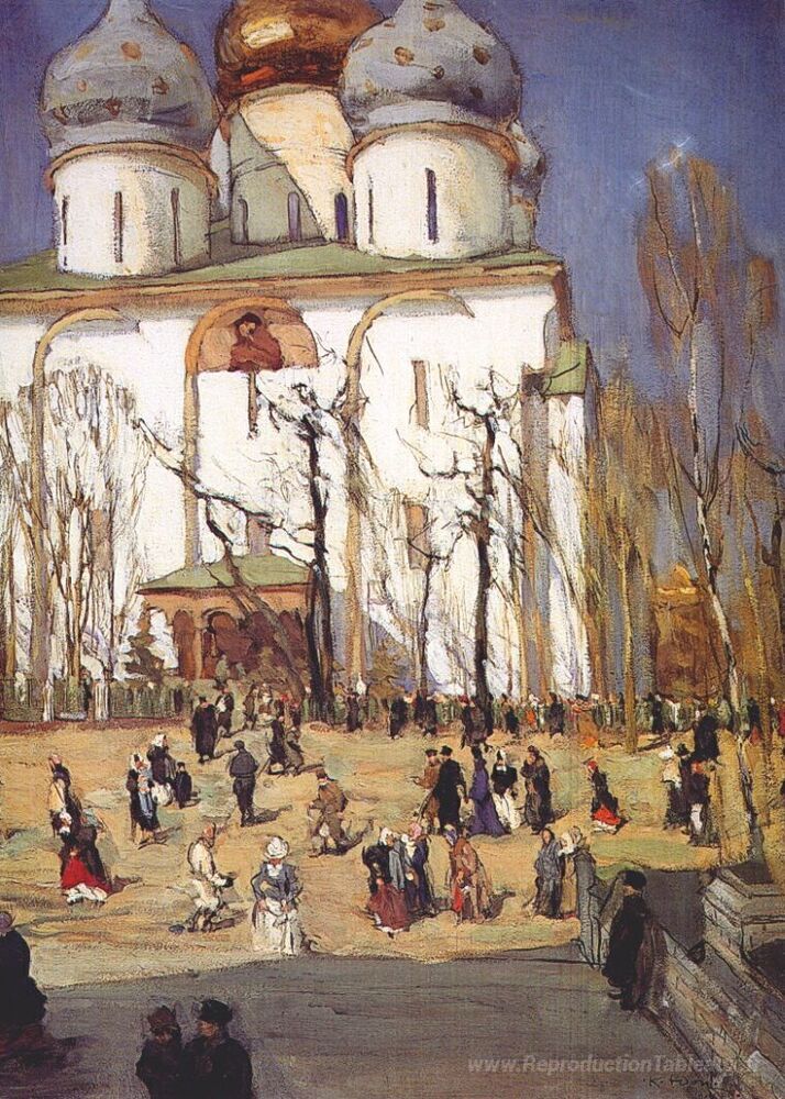 Nous vous proposons une reproduction artisanale sur toile du célèbre tableau 'Le jour de la célébration' de Konstantin Yuon, provenant du Musée de la Reproduction.