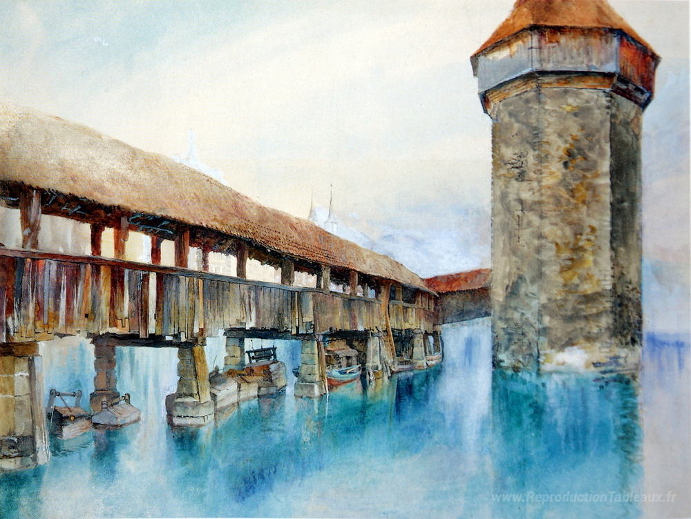 Nous vous proposons une reproduction artisanale sur toile du célèbre tableau 'Le Kapellbrücke, Lucerne' de John Ruskin, provenant du Musée de la Reproduction.