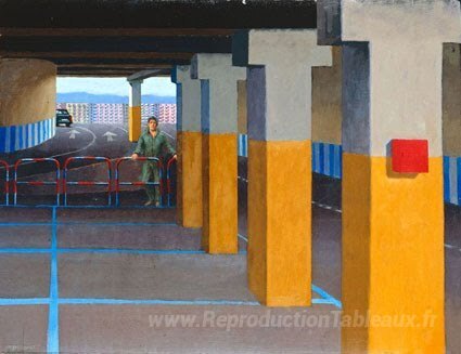 Nous vous proposons une reproduction artisanale sur toile du célèbre tableau 'Le parking du supermarché II' de Jeffrey Smart, provenant du Musée de la Reproduction.
