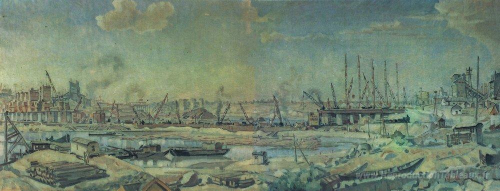 Nous vous proposons une reproduction artisanale sur toile du célèbre tableau 'Le paysage industriel' de Konstantin Bogaevsky, provenant du Musée de la Reproduction.