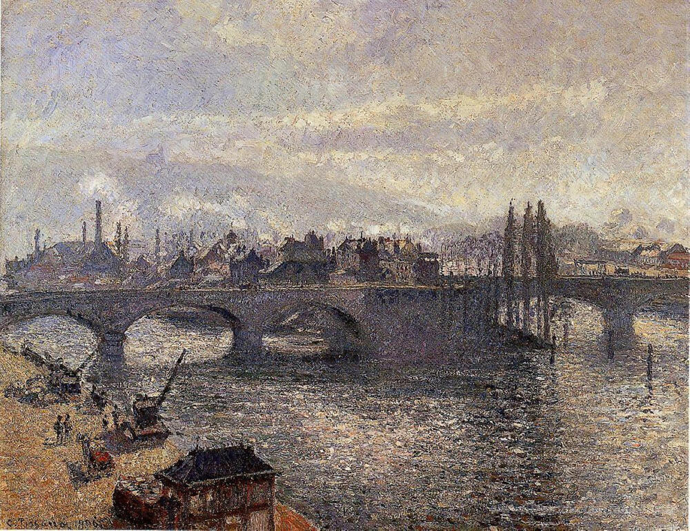 Nous vous proposons une reproduction artisanale sur toile du célèbre tableau 'Le Pont Corneille, Rouen, effet matinal' de Camille Pissarro, provenant du Musée de la Reproduction.