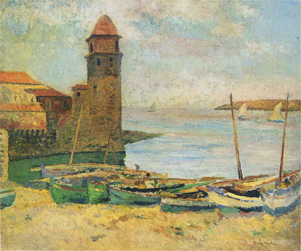 Nous vous proposons une reproduction artisanale sur toile du célèbre tableau 'Le port de Collioure' de Henri Martin, provenant du Musée de la Reproduction.