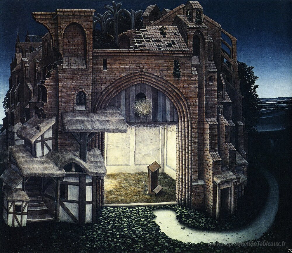 Nous vous proposons une reproduction artisanale sur toile du célèbre tableau 'Le silence' de Jacek Yerka, provenant du Musée de la Reproduction.