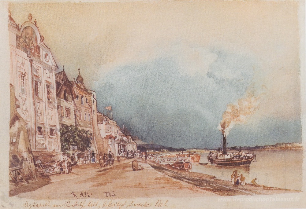 Nous vous proposons une reproduction artisanale sur toile du célèbre tableau 'Le site d'atterrissage à Stein an der Donau' de Rudolf von Alt, provenant du Musée de la Reproduction.