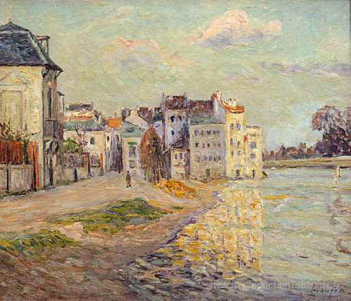 Nous vous proposons une reproduction artisanale sur toile du célèbre tableau 'Le talus de lagny sous les inondations' de Maxime Maufra, provenant du Musée de la Reproduction.