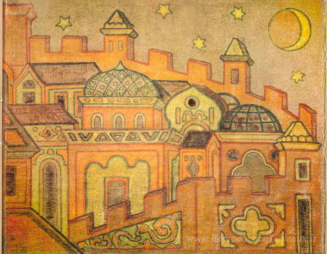 Nous vous proposons une reproduction artisanale sur toile du célèbre tableau 'Les villes' de Nicholas Roerich, provenant du Musée de la Reproduction.