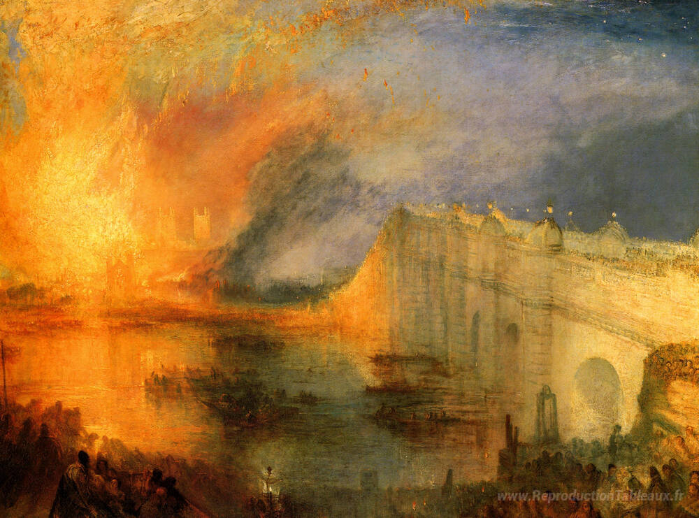 Nous vous proposons une reproduction artisanale sur toile du célèbre tableau 'L'incendie des chambres du Parlement' de William Turner, provenant du Musée de la Reproduction.