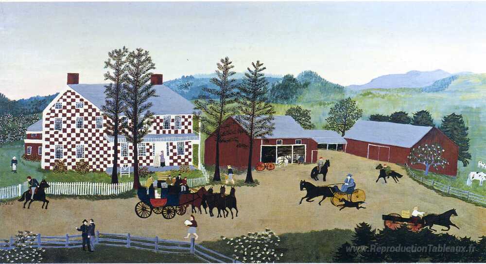 Nous vous proposons une reproduction artisanale sur toile du célèbre tableau 'Maison à carreaux' de Grandma Moses, provenant du Musée de la Reproduction.