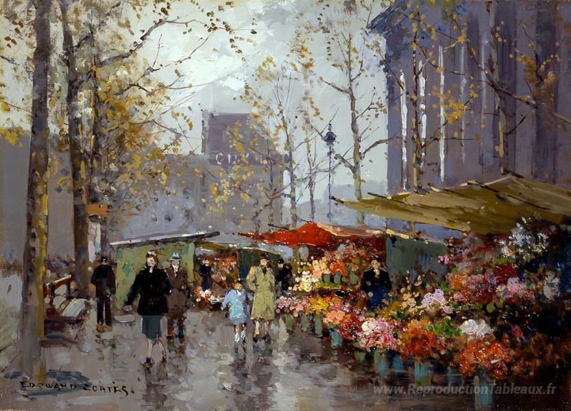 Nous vous proposons une reproduction artisanale sur toile du célèbre tableau 'Marché des fleurs à La Madeleine' de Edouard Cortes, provenant du Musée de la Reproduction.