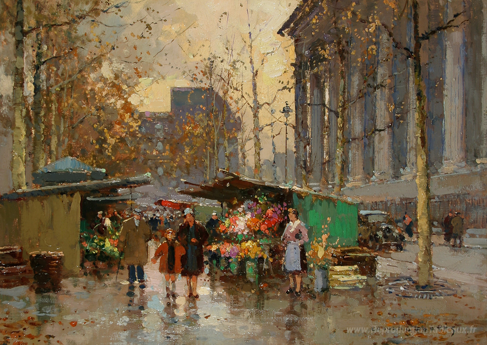 Nous vous proposons une reproduction artisanale sur toile du célèbre tableau 'Marché des fleurs à La Madeleine' de Edouard Cortes, provenant du Musée de la Reproduction.