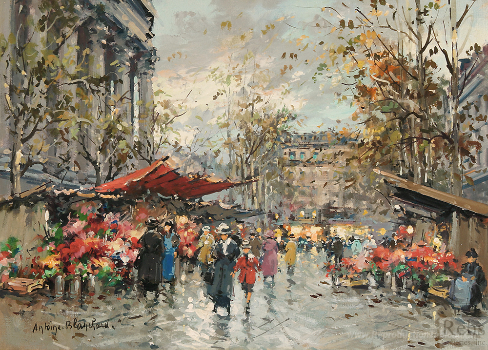 Nous vous proposons une reproduction artisanale sur toile du célèbre tableau 'Marché des fleurs Madeleine' de Antoine Blanchard, provenant du Musée de la Reproduction.