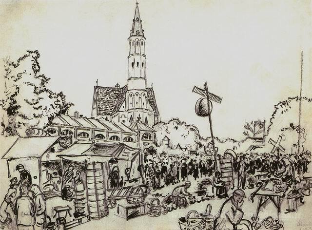 Nous vous proposons une reproduction artisanale sur toile du célèbre tableau 'Marketplace à Siauliai' de Mstislav Dobuzhinsky, provenant du Musée de la Reproduction.