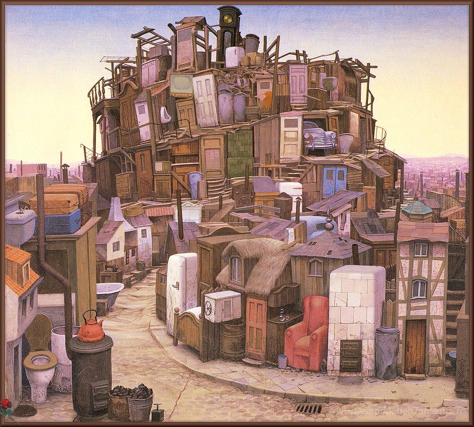Nous vous proposons une reproduction artisanale sur toile du célèbre tableau 'Metropolis II' de Jacek Yerka, provenant du Musée de la Reproduction.