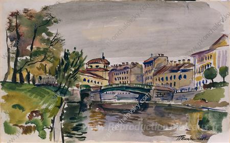 Nous vous proposons une reproduction artisanale sur toile du célèbre tableau 'Moika. Bridge à trois arches.' de Pyotr Konchalovsky, provenant du Musée de la Reproduction.