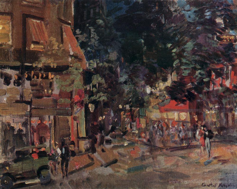 Nous vous proposons une reproduction artisanale sur toile du célèbre tableau 'Montmartre le soir' de Konstantin Korovin, provenant du Musée de la Reproduction.