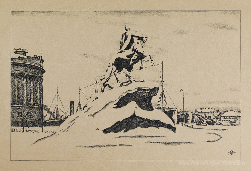 Nous vous proposons une reproduction artisanale sur toile du célèbre tableau 'Monument à Peter le Grand' de Mstislav Dobuzhinsky, provenant du Musée de la Reproduction.