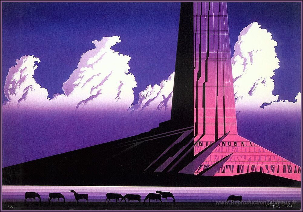 Nous vous proposons une reproduction artisanale sur toile du célèbre tableau 'Monument violet' de Eyvind Earle, provenant du Musée de la Reproduction.