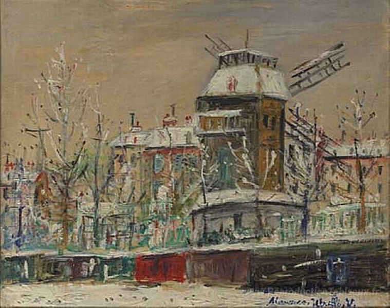 Nous vous proposons une reproduction artisanale sur toile du célèbre tableau 'Moulin de la Galette sous la neige' de Maurice Utrillo, provenant du Musée de la Reproduction.