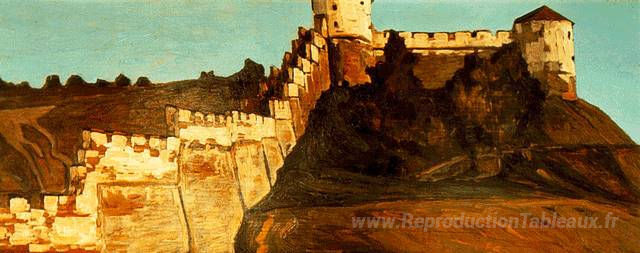 Nous vous proposons une reproduction artisanale sur toile du célèbre tableau 'Murs de Kremlin à Novgorod' de Nicholas Roerich, provenant du Musée de la Reproduction.