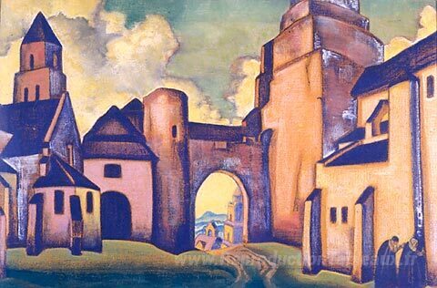 Nous vous proposons une reproduction artisanale sur toile du célèbre tableau 'Mystère des murs' de Nicholas Roerich, provenant du Musée de la Reproduction.