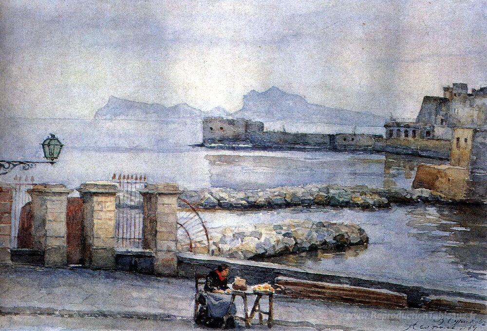 Nous vous proposons une reproduction artisanale sur toile du célèbre tableau 'Napoli. Enbankment.' de Vasily Surikov, provenant du Musée de la Reproduction.