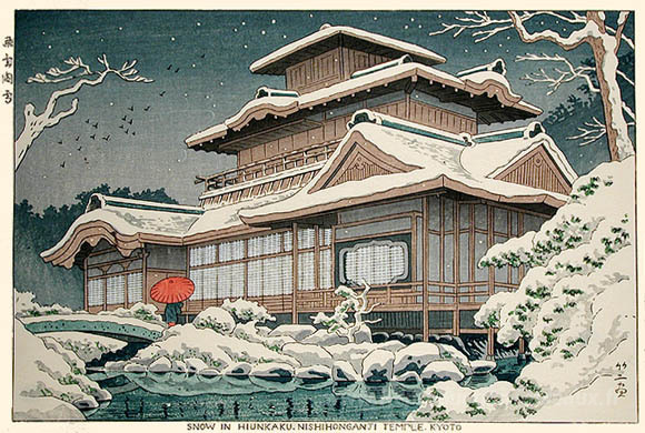 Nous vous proposons une reproduction artisanale sur toile du célèbre tableau 'Neige au temple Hiunkaku, Kyoto' de Asano Takeji, provenant du Musée de la Reproduction.