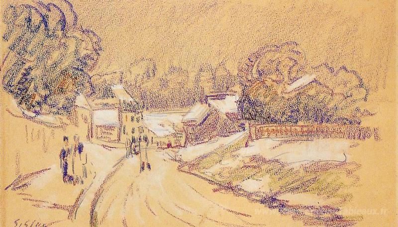 Nous vous proposons une reproduction artisanale sur toile du célèbre tableau 'Neige précoce à Louveciennes' de Alfred Sisley, provenant du Musée de la Reproduction.