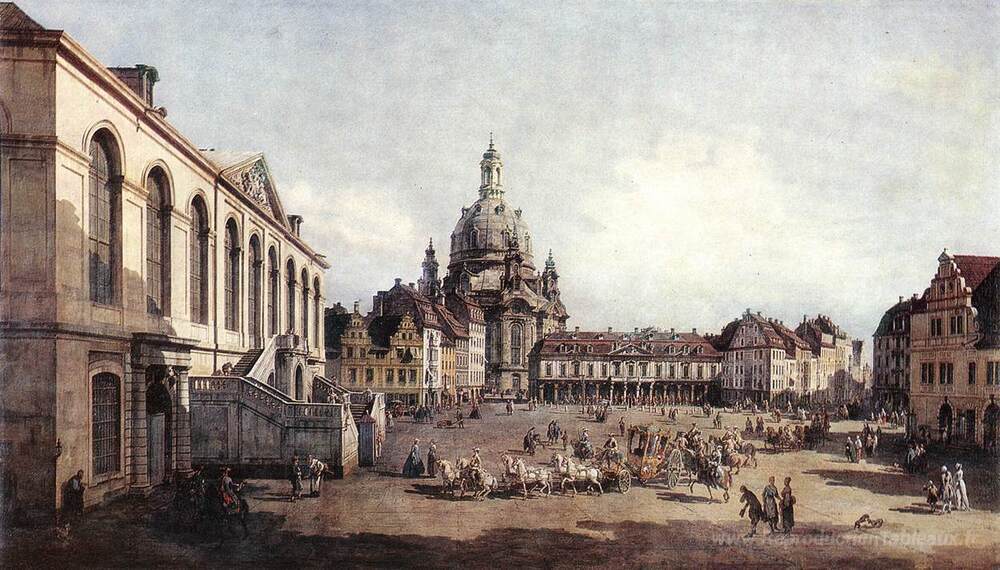 Nous vous proposons une reproduction artisanale sur toile du célèbre tableau 'New Market Square à Dresde du Jüdenhof' de Bernardo Bellotto, provenant du Musée de la Reproduction.