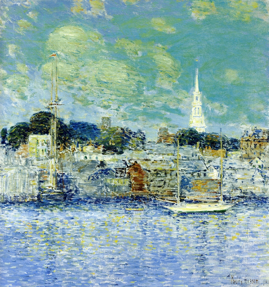 Nous vous proposons une reproduction artisanale sur toile du célèbre tableau 'Newport Waterfront' de Childe Hassam, provenant du Musée de la Reproduction.