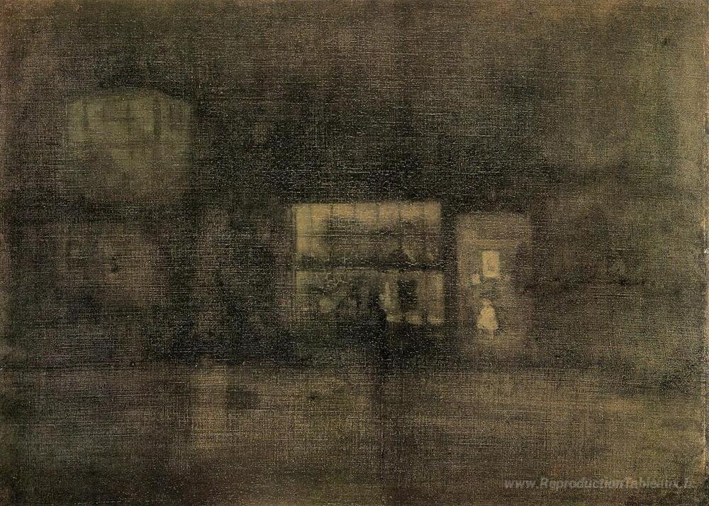 Nous vous proposons une reproduction artisanale sur toile du célèbre tableau 'Nocturne Black and Gold - The Rag Negozio, Chelsea' de James McNeill Whistler, provenant du Musée de la Reproduction.
